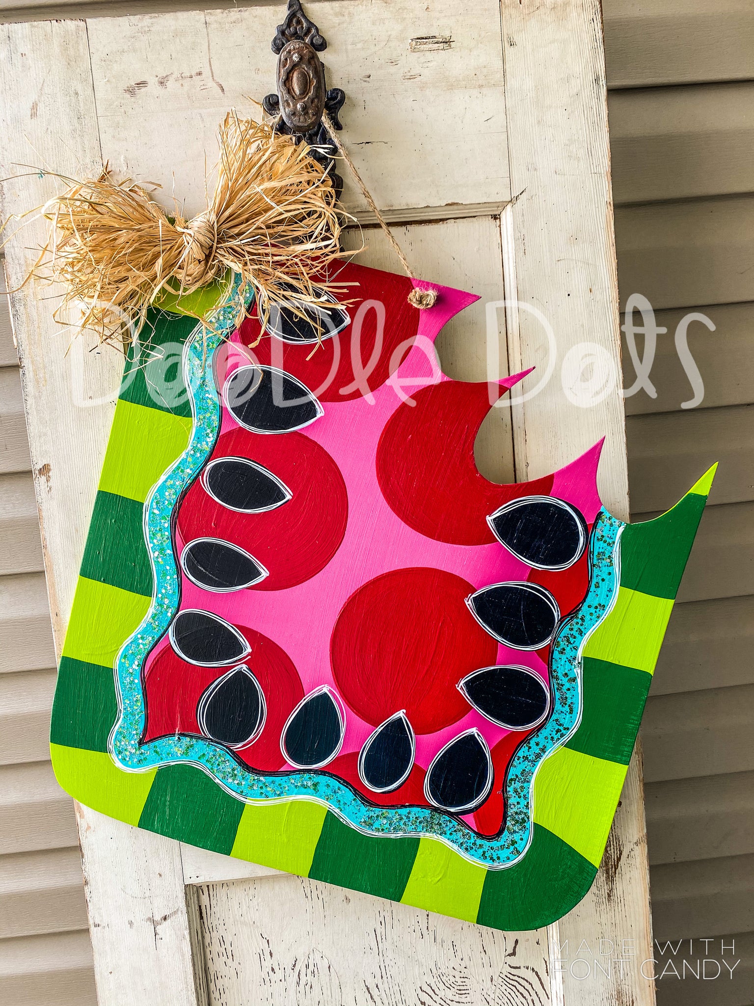 Painted on 1/4 in wood. Measures 24.5 by 23.5 in. Painted with glitter accents. If you don’t want glitter please make known in notes section of your order. Comes with raffia bow and sealed from weather.