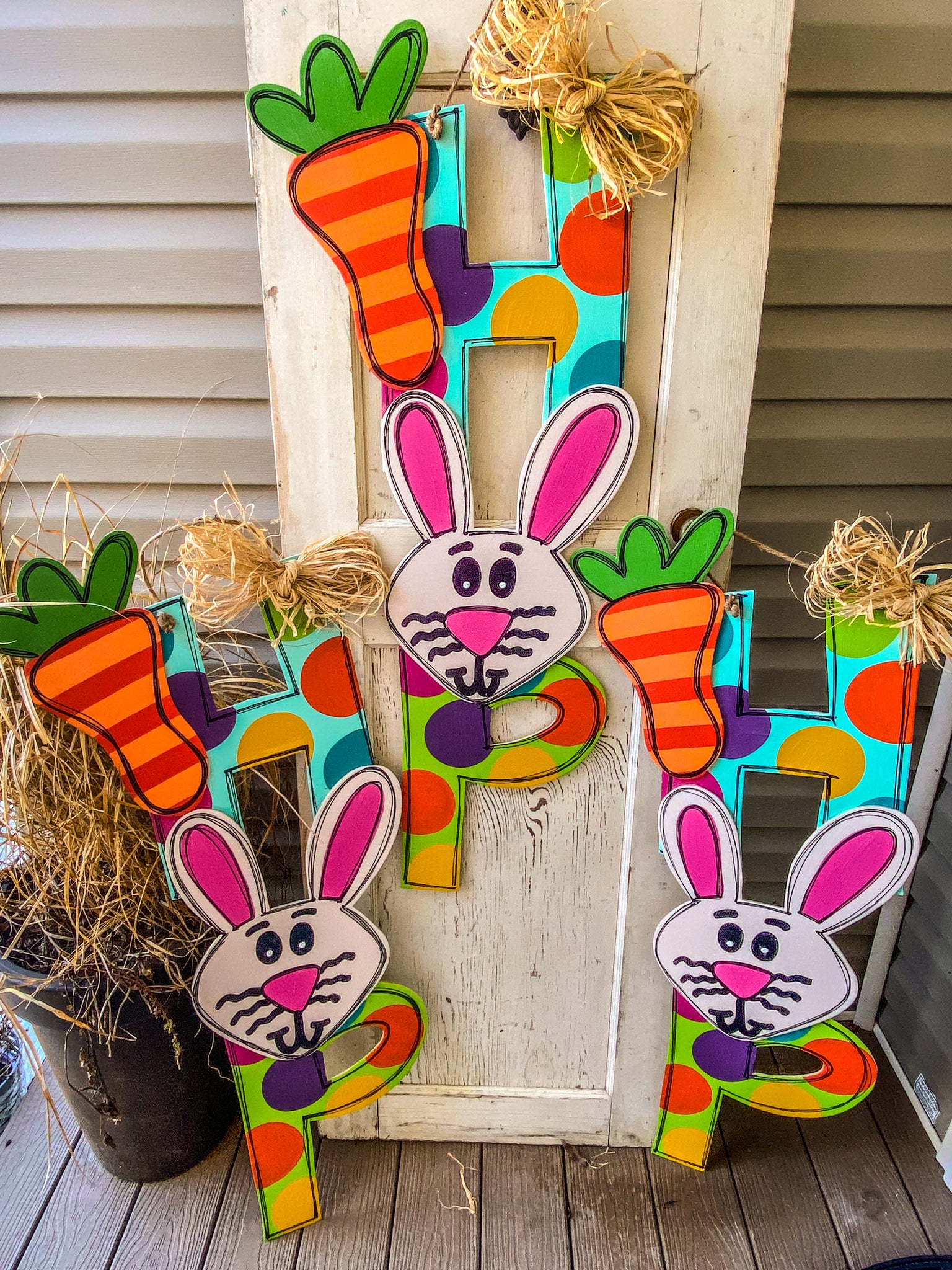 Painted on 1/4 in wood. Measures around 46 in tall and 19 in wide. Comes with raffia bow and sealed from the weather. These will attach with Velcro. They will be unattached when shipped.