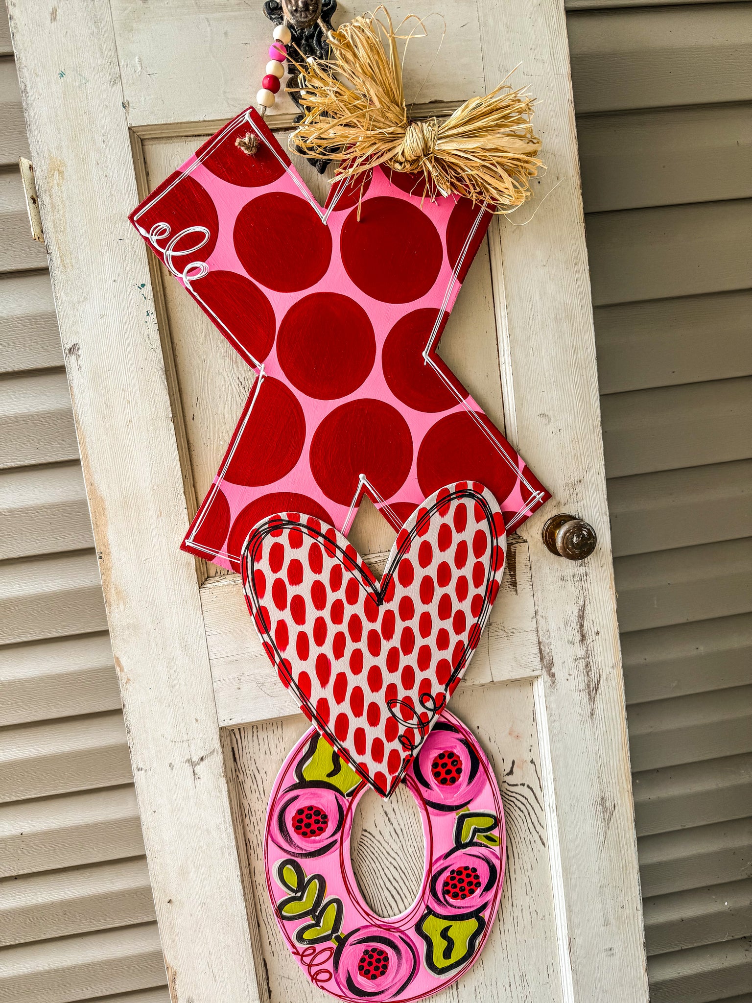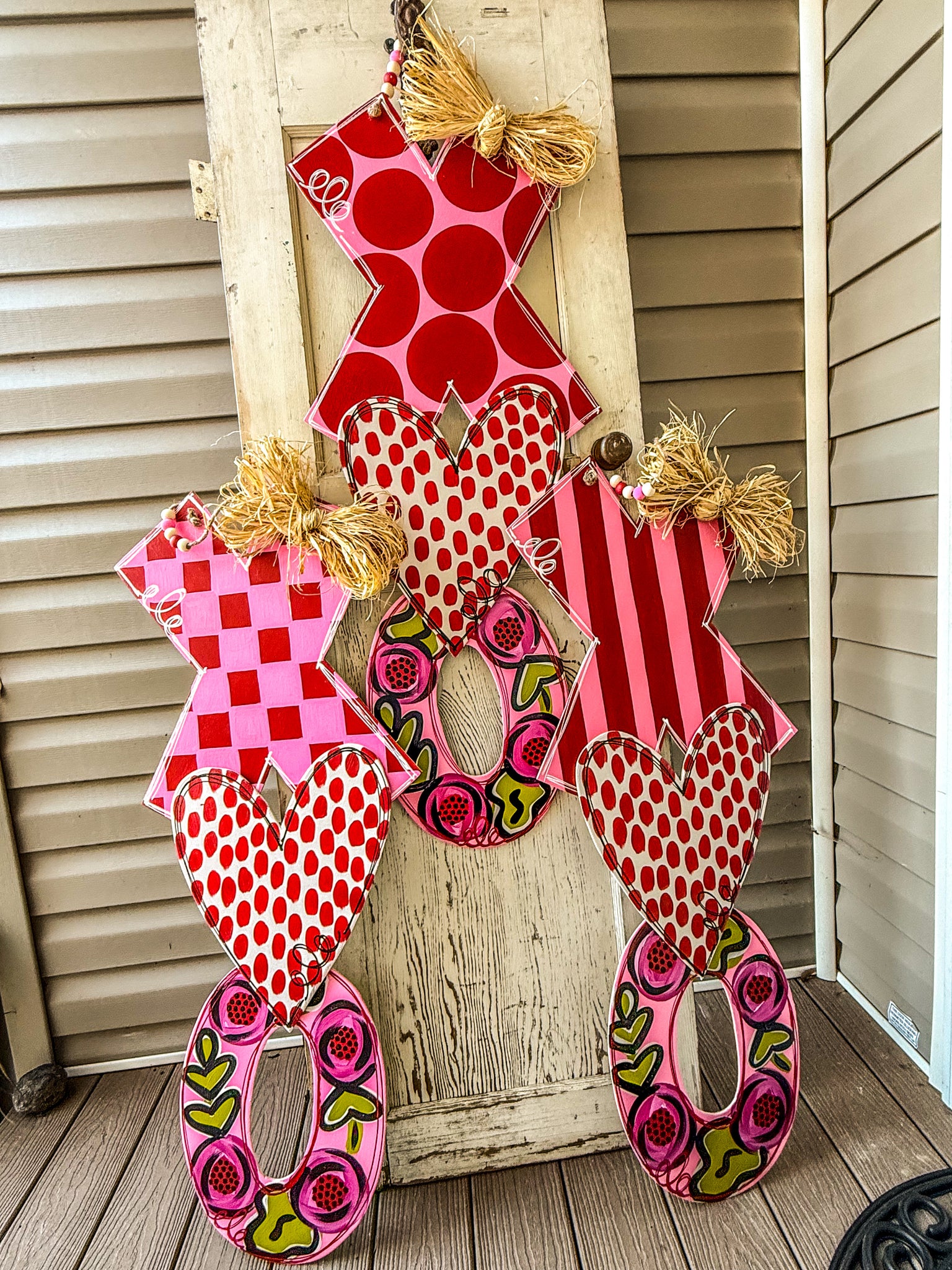 Painted on 1/4 in wood. Measures around 40 in tall. Each piece is Velcro together and you just stick it together when received. Comes with raffia bow and sealed.