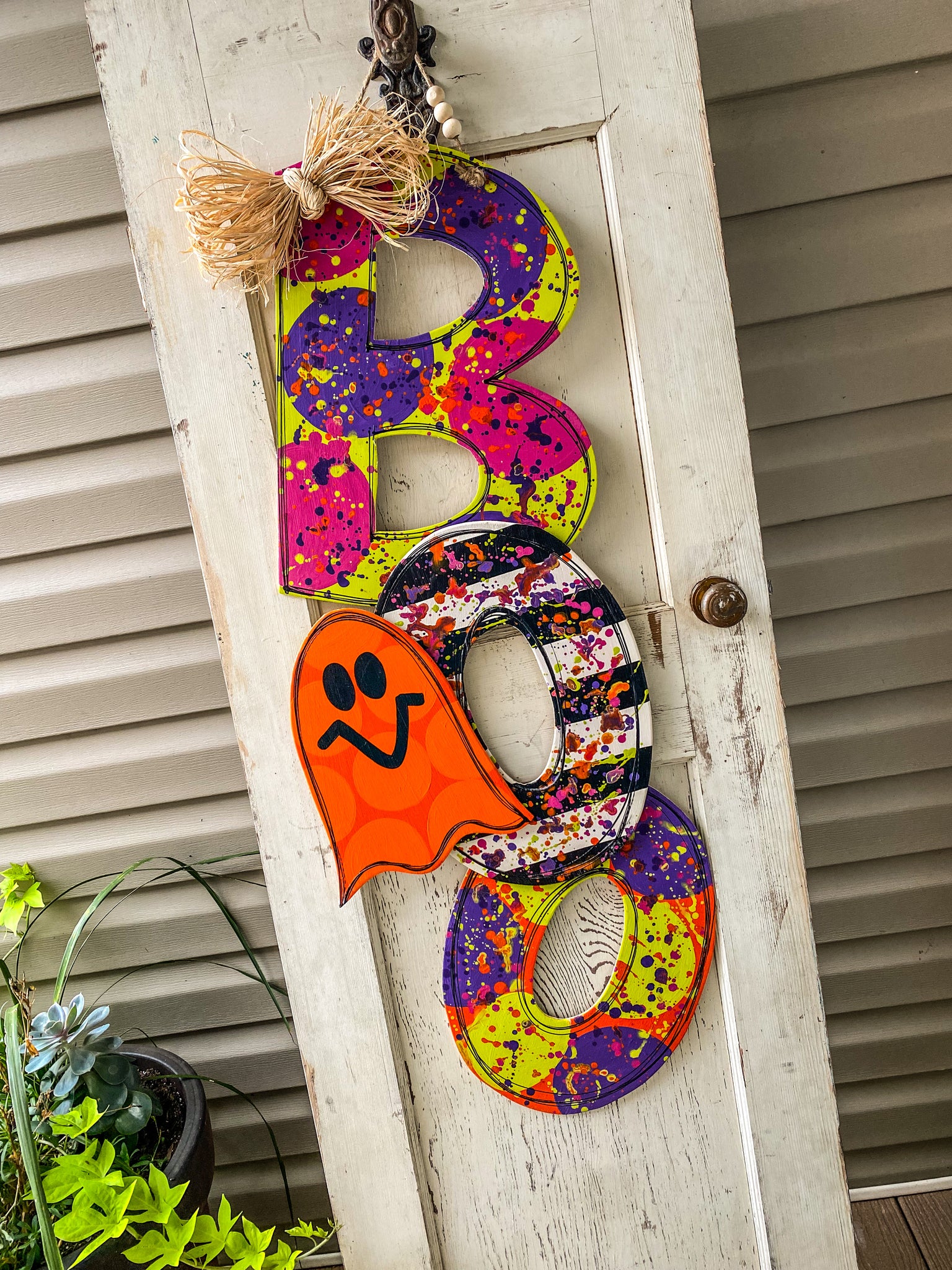 Painted on 1/4 in thick wood. Measures around 43 in tall and 17 in wide. Sealed with a waterproof sealer. Comes with a raffia bow. Each letter is attached with Velcro.