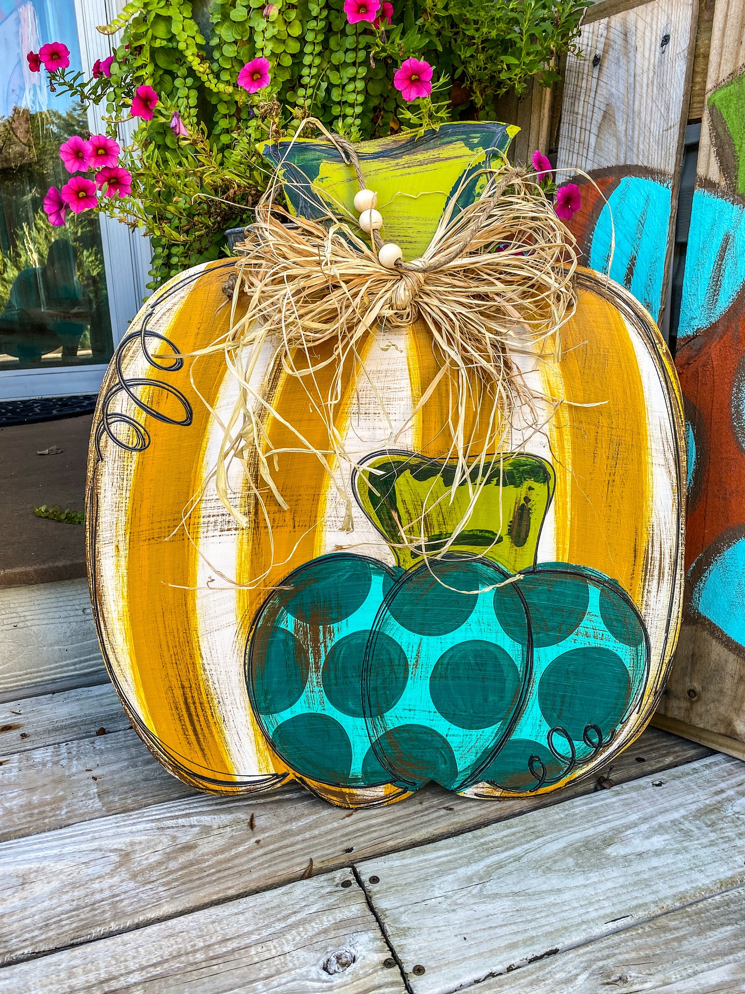 Painted on 1/4 in wood. Measures 21 in wide and 22 in tall. Sealed with a waterproof sealer. Comes with a raffia bow.
