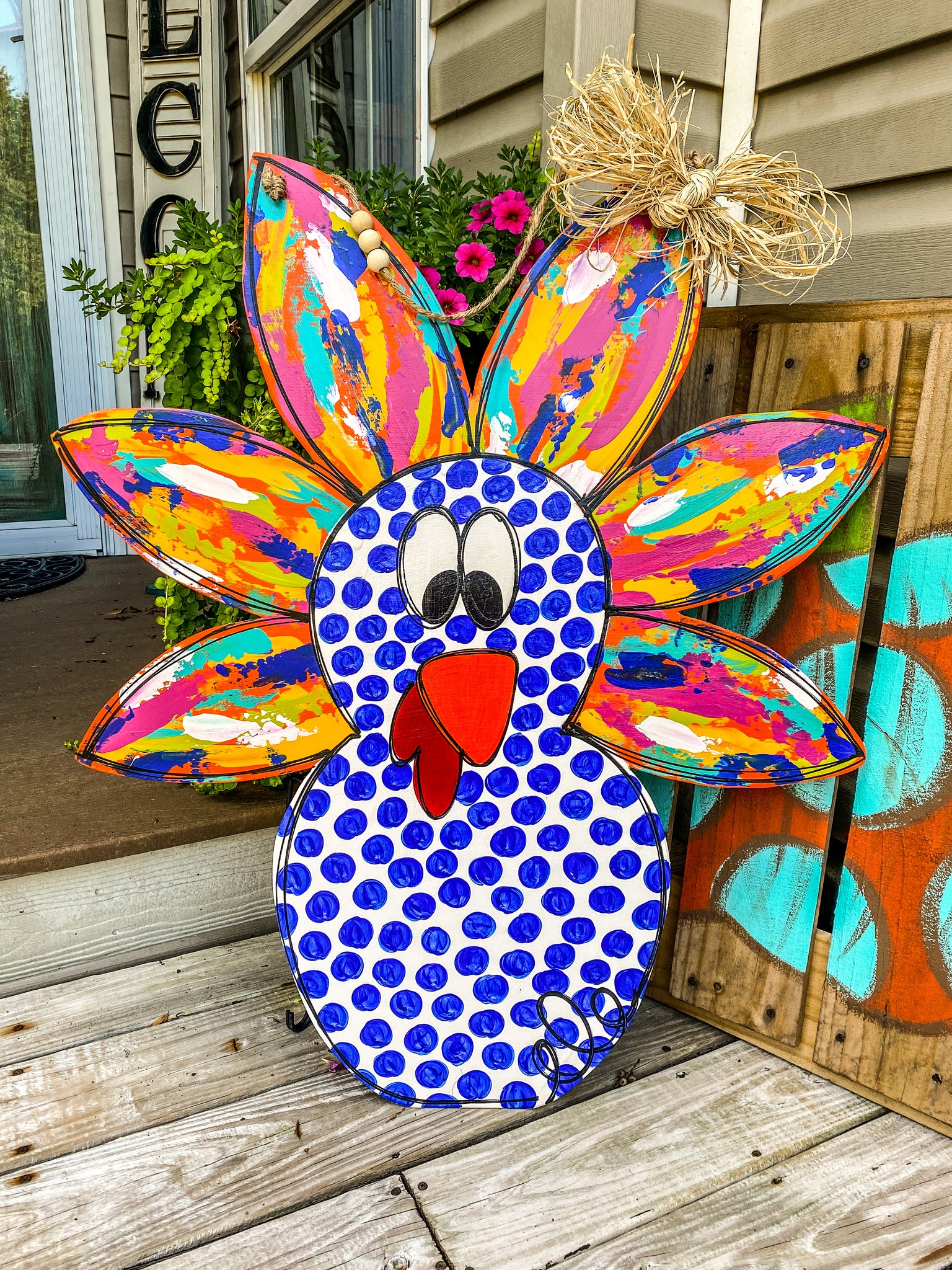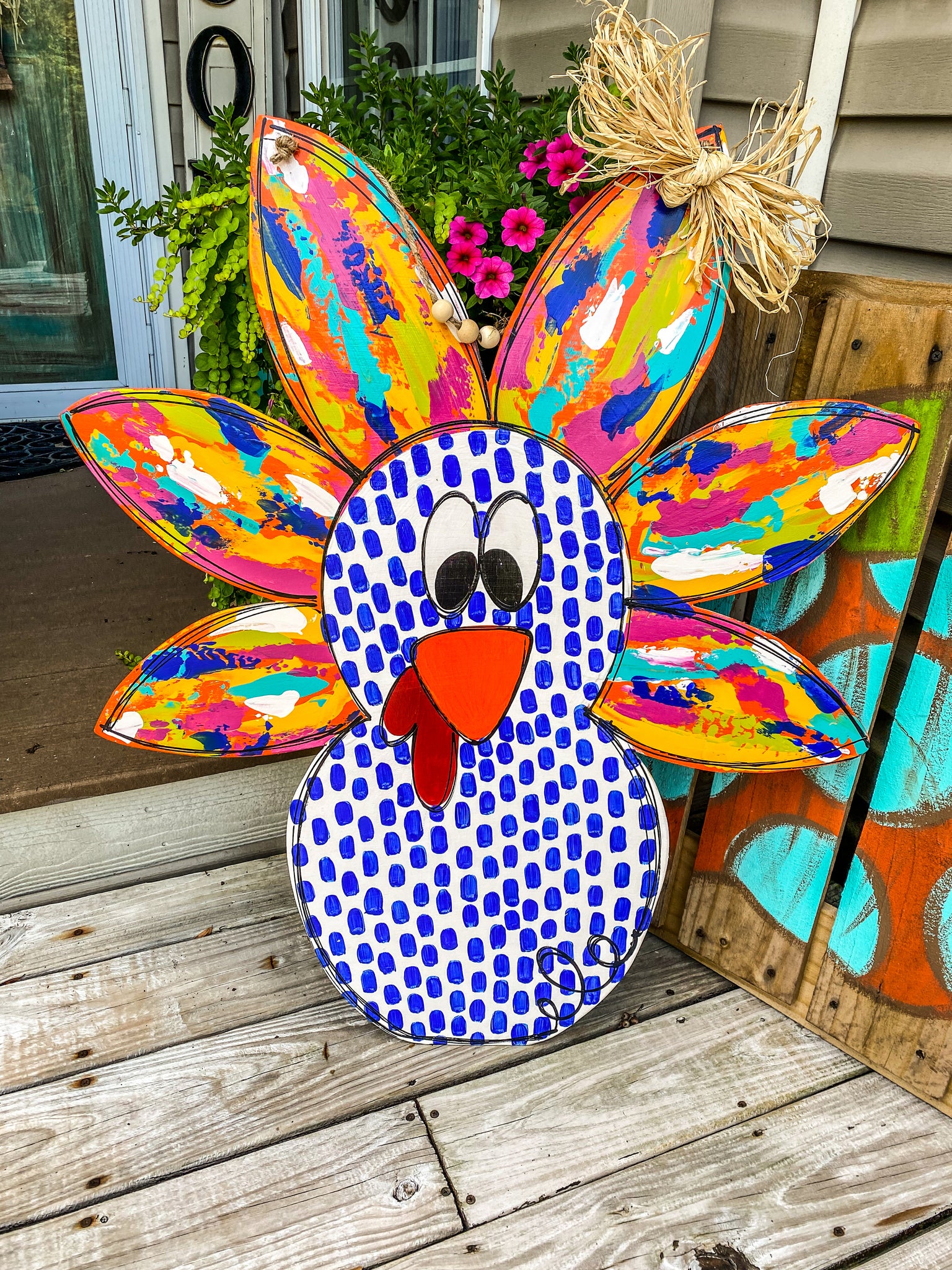 Painted on 1/4 in wood. This gobbler measures 35 in tall and 29 in wide! Comes sealed with a waterproof sealer and raffia bow.