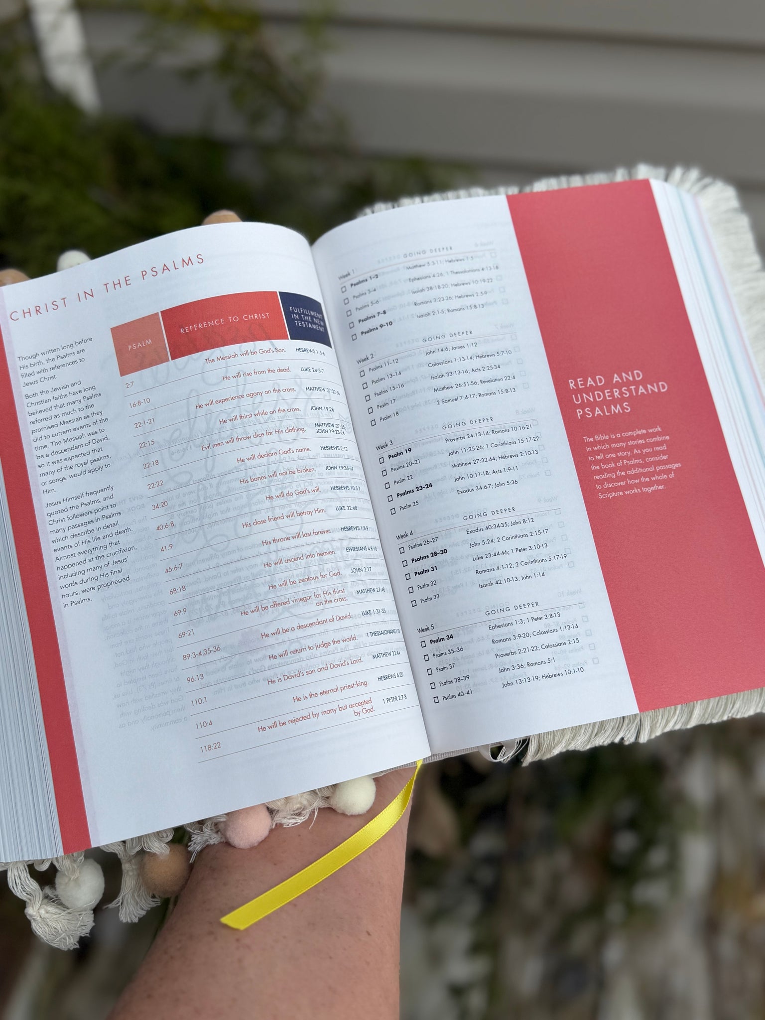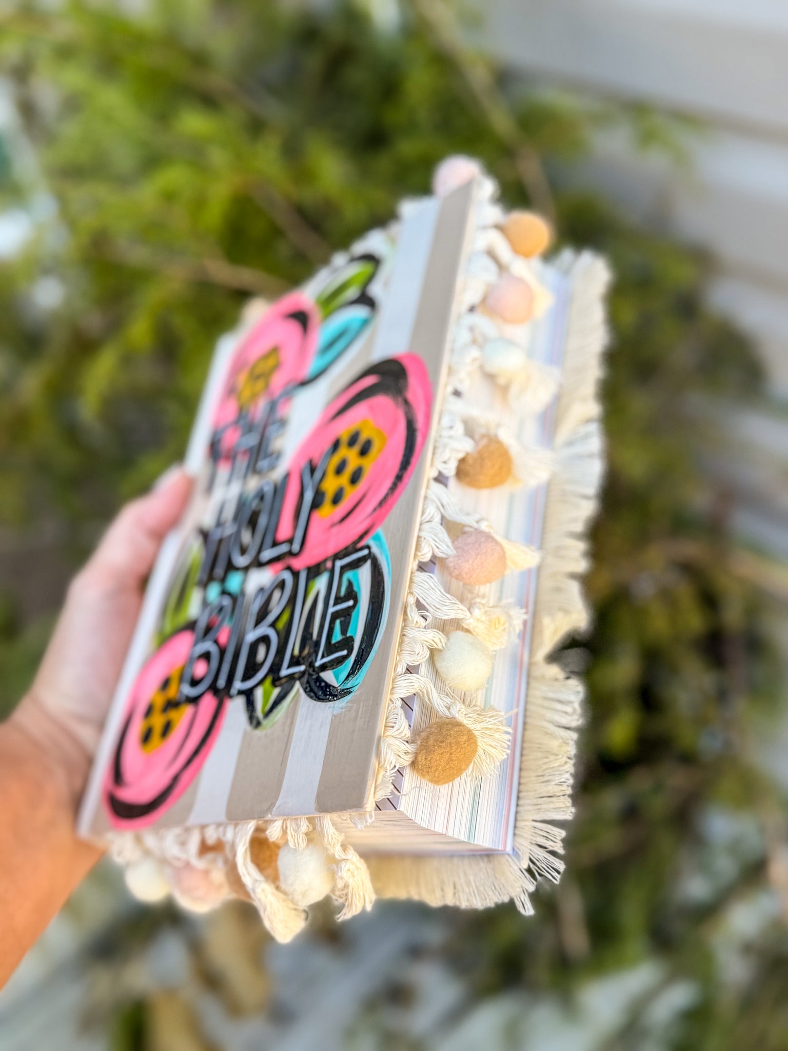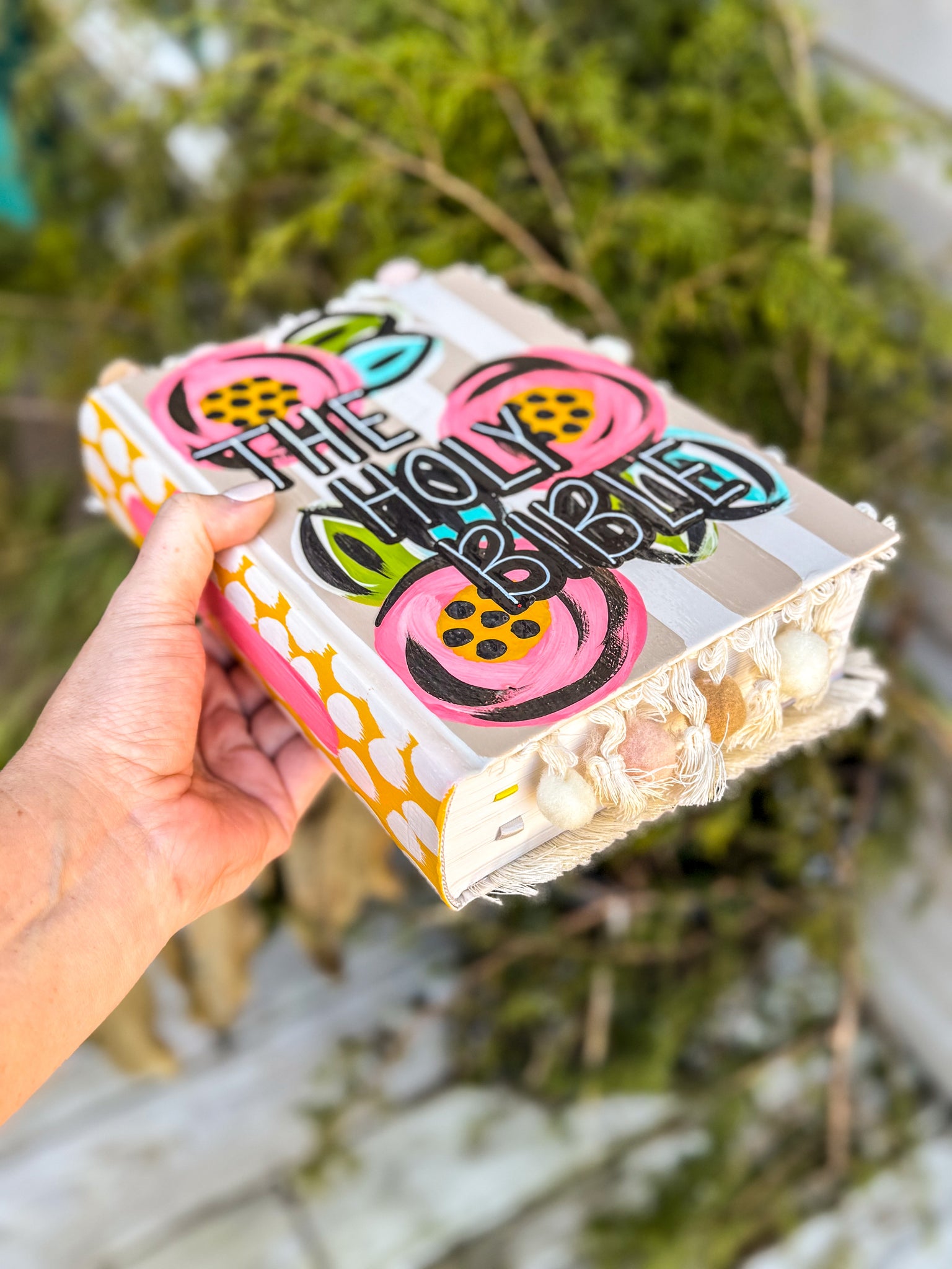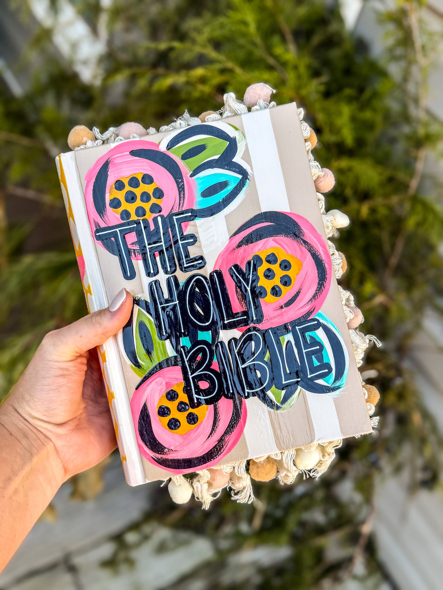 Hand painted with multiple coats of sealer all the way around. This is a She Reads Truth Christian Standard Bible.