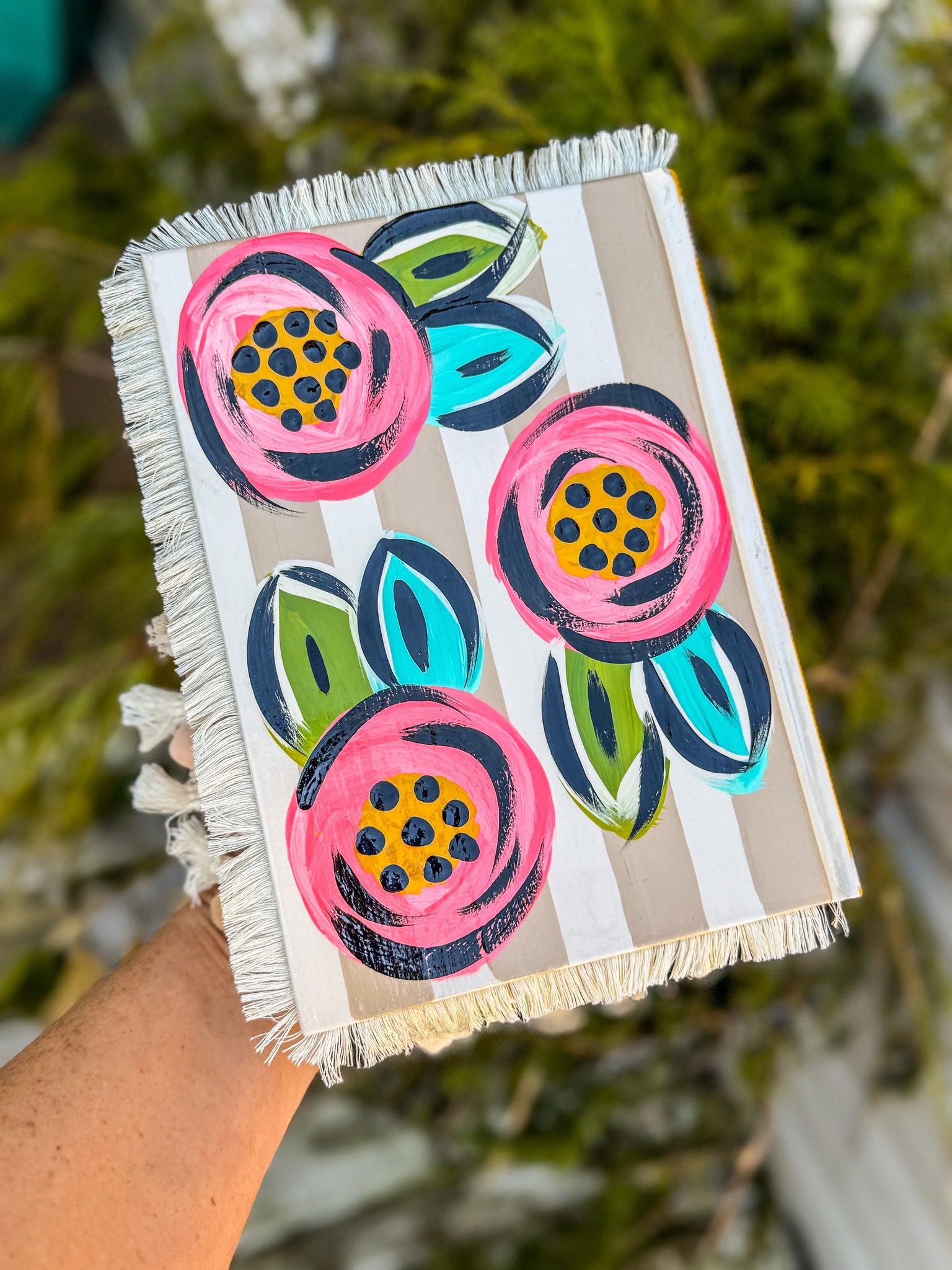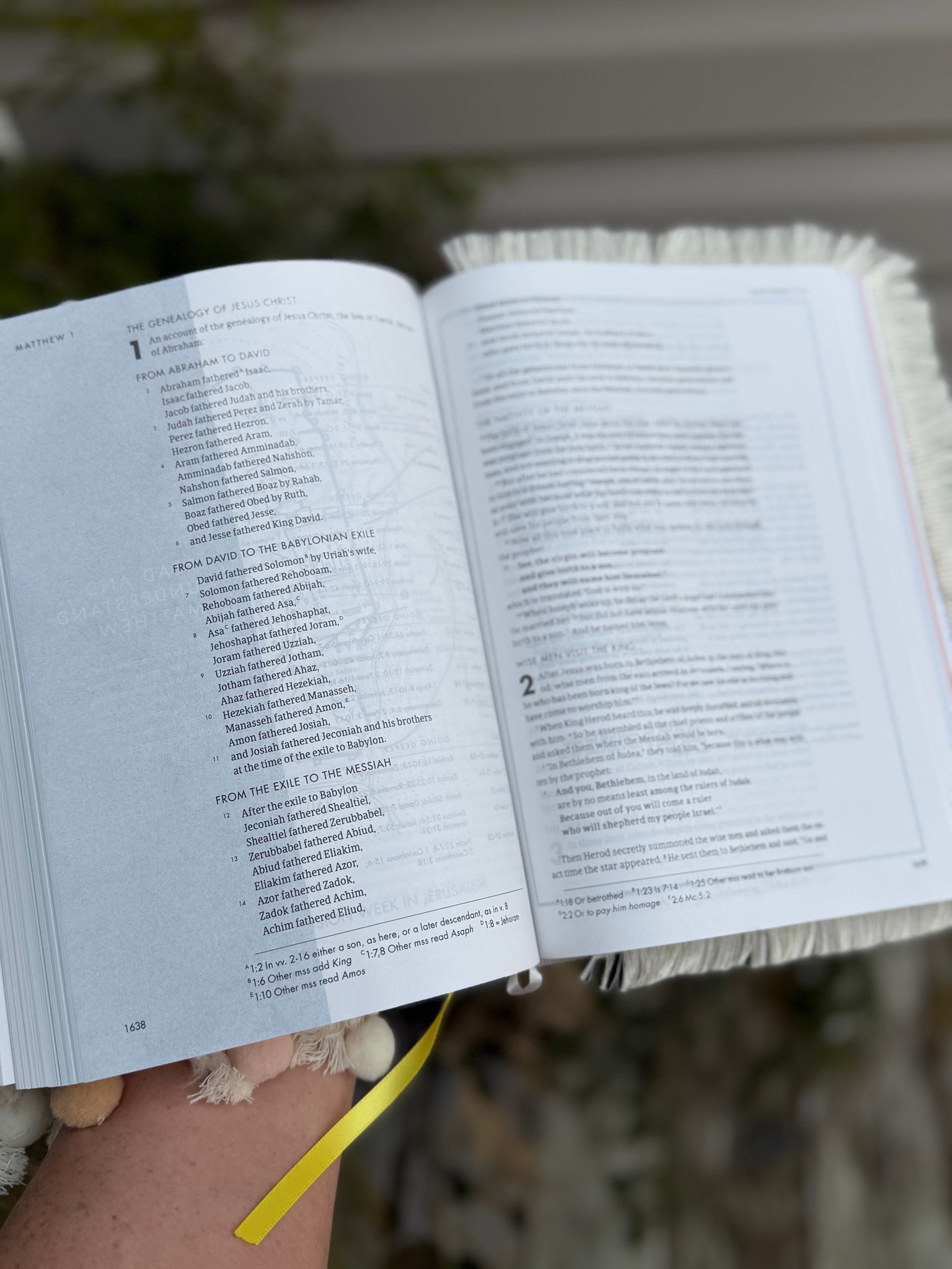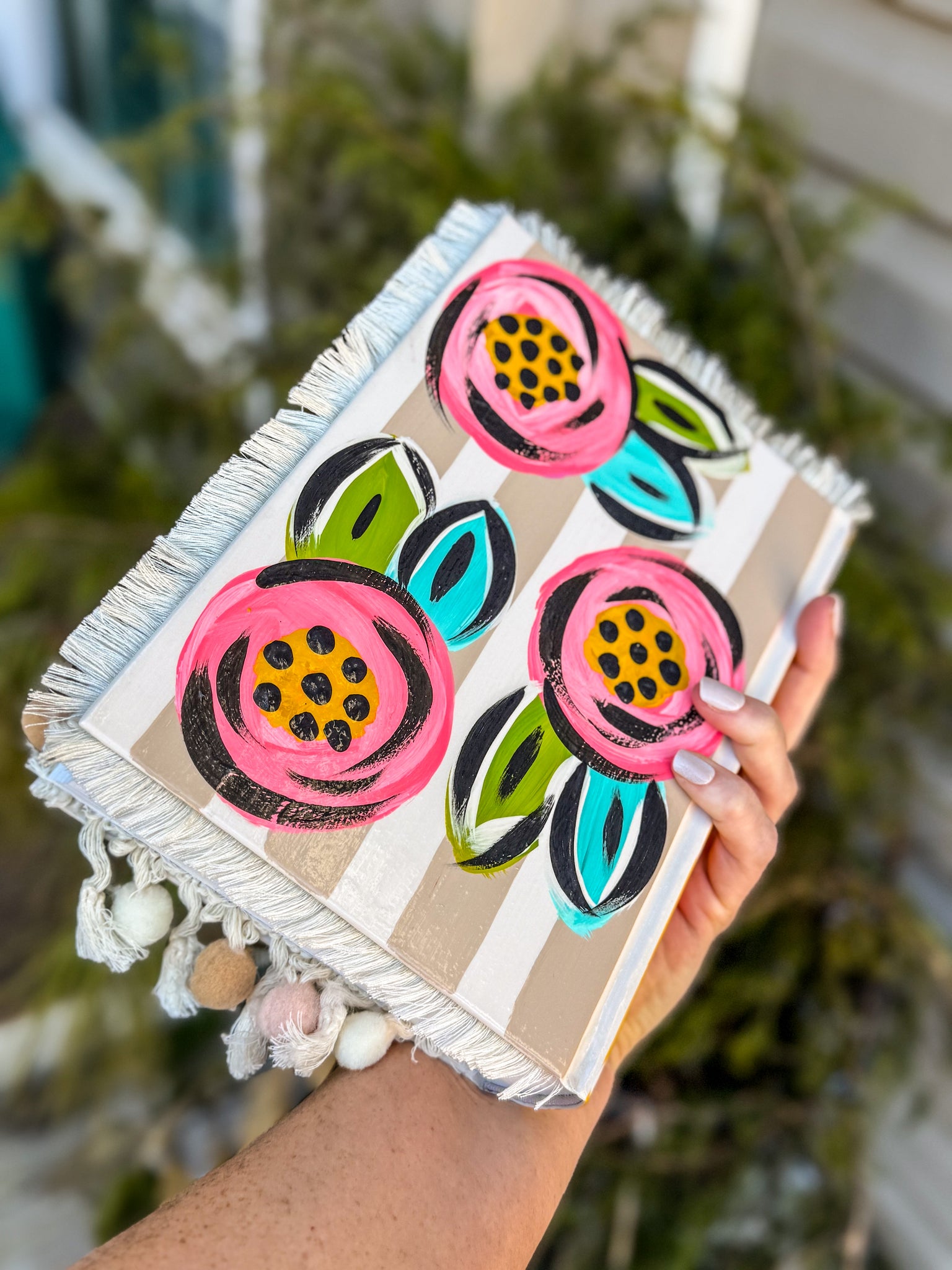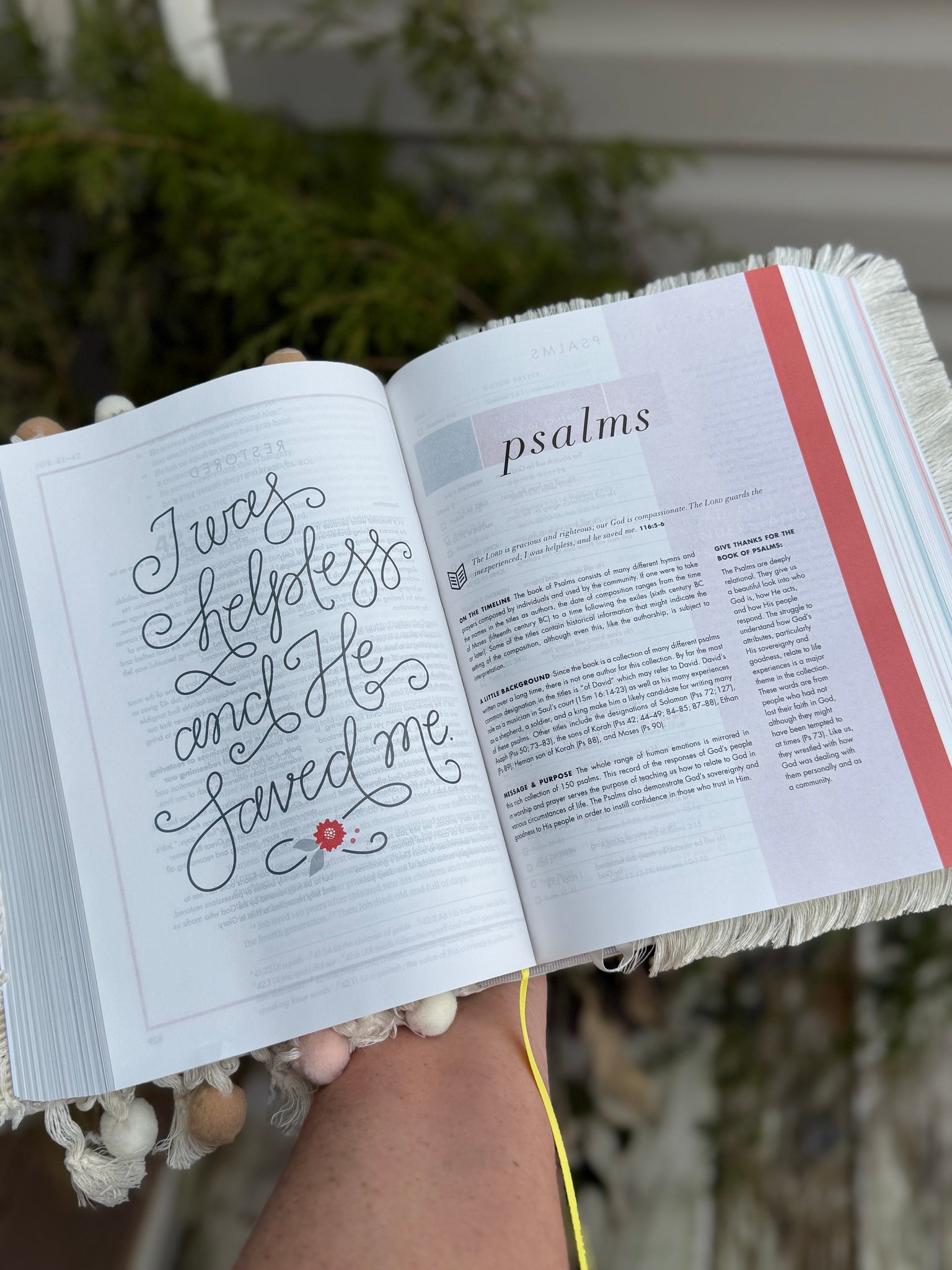 Hand painted with multiple coats of sealer all the way around. This is a She Reads Truth Christian Standard Bible.